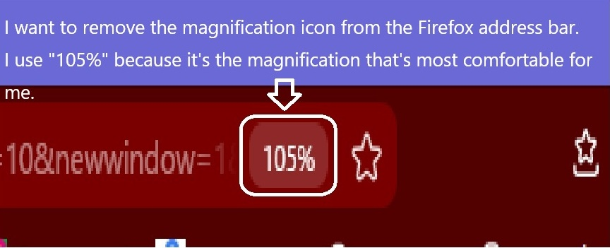 Thank you in advance. I have a question about the "Screen zoom ratio" that appears in the Firefox address bar. I don't know how to hide it. The address bar is set to 105%, which I find to be the best zoom ratio, so I keep it set to that. I know you're busy, but I would really appreciate it if you could let me know. Thank you very much.