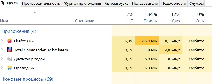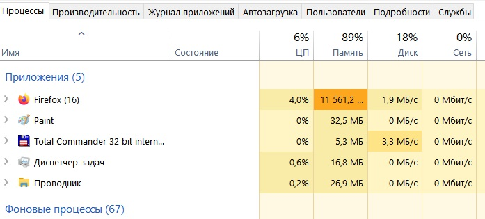 In processes, only Firefox takes up all the memory, as I mentioned above. Interestingly, initially (when launching Fox), the memory disappears—in "processes," it shows memory usage from 16 GB almost immediately to 10-11 GB—that is, 80%+ of the memory. But after some time, the memory "used" by Fox decreases to 2-3 GB, but the percentage of memory used remains the same—80%... Fantastic!