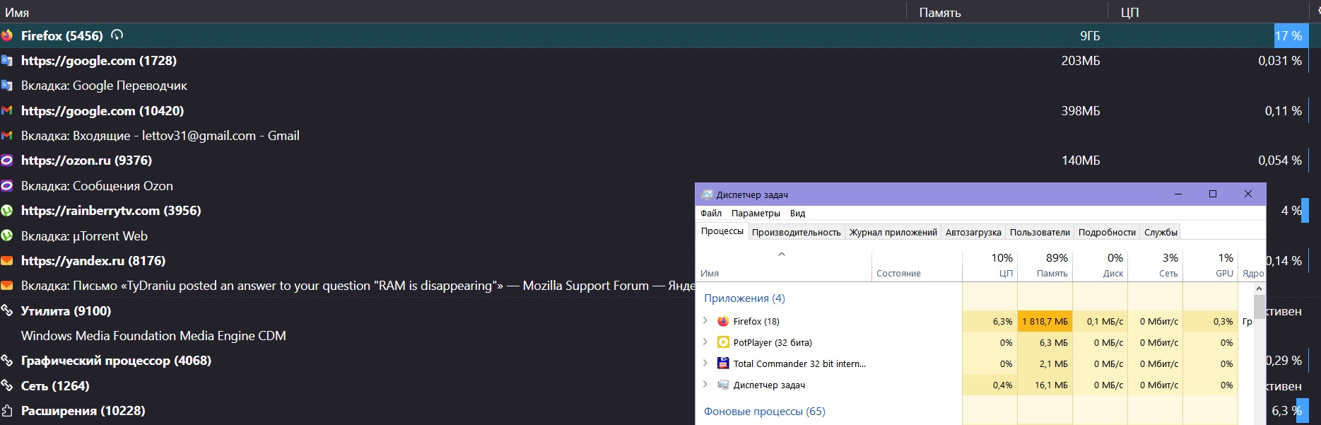 I always have multiple tabs open in my browser. Previously, I could easily open (and switch between) 20+ tabs (I have 16GB of RAM). Recently, after opening five tabs, the Task Manager shows 10-11GB of RAM (88-90%) in use! How can this be? I cleared the cache and history, but it didn't help. I installed several RAM cleaners, but none freed up the required amount. None of the five programs worked. Where does that 15GB of RAM go when I open Firefox? When will you finally implement something like Google Chrome—they free up RAM for active pages when inactive ones are opened. Maybe it's because I have so many inactive tabs that the RAM is disappearing? But I had just as many tabs before, some of them inactive, and fewer than 20 active ones, so I could easily open another 20. And now I can't even open five new ones. What's happening to the browser?! SOS!