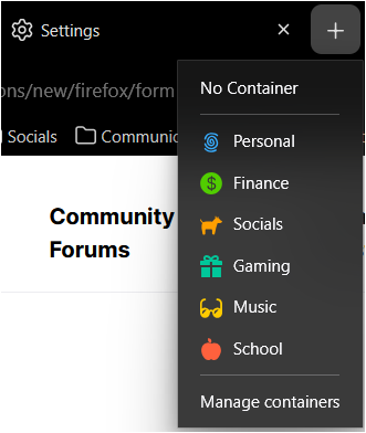 I know that there is already default containers built-in without the need of the extension. But there's no way to open tabs in containers when we click a link, only when it's typed in. There's an option in settings that allow to pick a container when a new tab is opened, but that's it. It would also be great to move the Mozilla VPN and integration and sync function from the extension to the settings page for easier access.