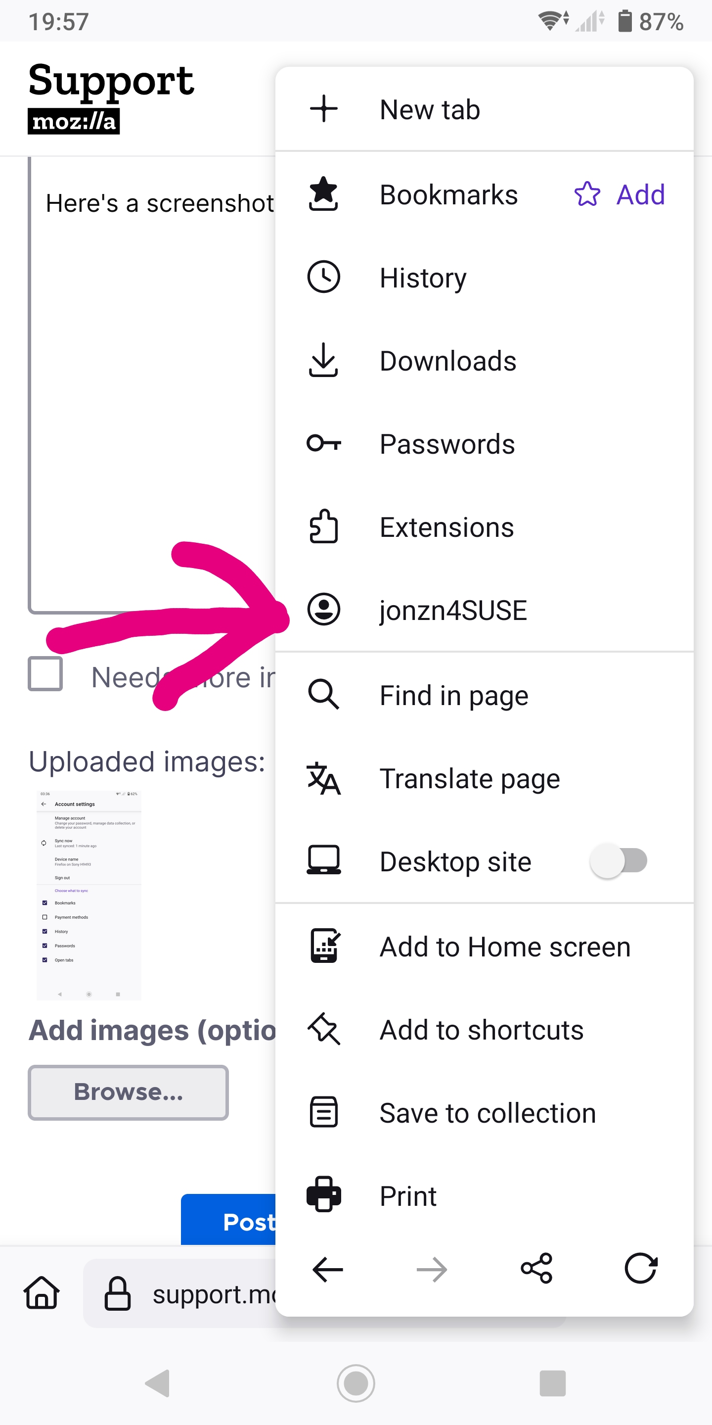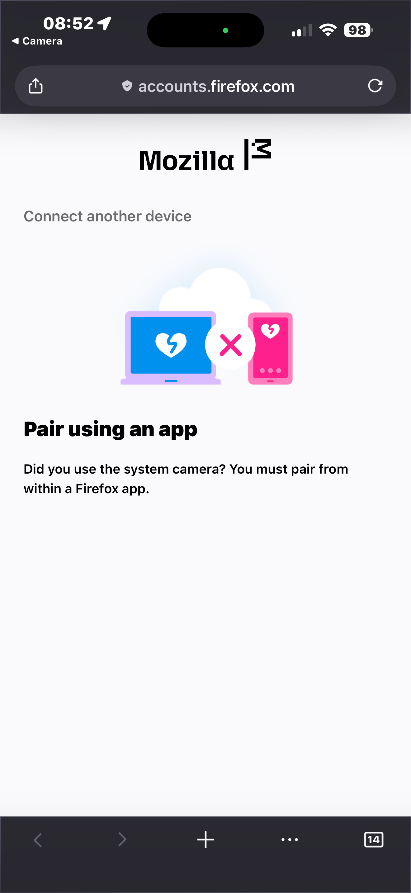 I am trying to synchronise my web browser on my phone to my laptop, but when I try to do so using the QR code I get an error saying I need to use a Mozilla app to do it rather than my phone camera app (see attached)