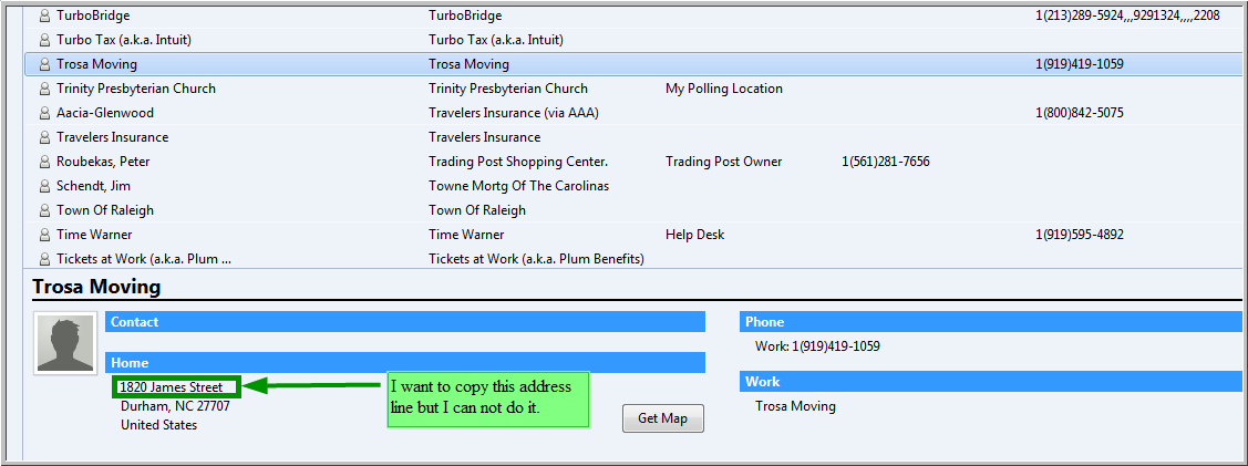 A lot of times I need to copy a Address book contact field value. Since I keep the contact pane open I can see the contact field value and want to just copy it to the clipboard. See screen capture. Is there a way to permit values in the contact pane to get highlighted and copied to the clipboard? I know I can double click the Directory pane and open the contact then navigate to tab that has the value I want to copy the clip board. But why do I have to do all that when the value is already on the screen?