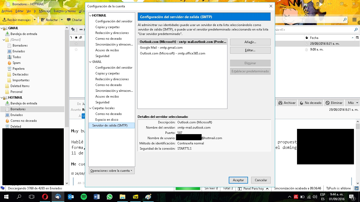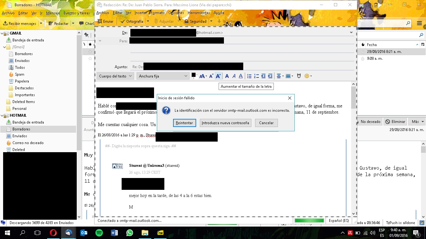 Cuando intento envíar algún correo electrónico de mi cuenta de HOTMAIL, me salé el siguiente error: "La identificación con el servidor smtp-mail.outlook.com es incorrecta". No he podido envíar ningún correo desde hace una semana (algo muy grave, yo trabajo a distancia y necesito envíar correos electrónicos constantemente.