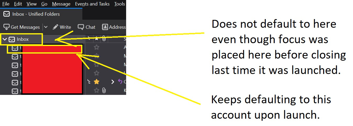 1. In Thunderbird 68, it remembers which inbox it was last focused on before closing. In Thunderbird 78, it now always defaults to the first primary account. I usually leave the focus to highlight "Inbox" since I have it setup for a unified Inbox view.