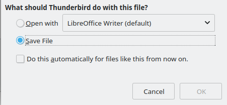With docx for example, it works perfectly. I get the same prompt but "Save File" is pre-selected. I can press enter and another prompt about the saving location opens.