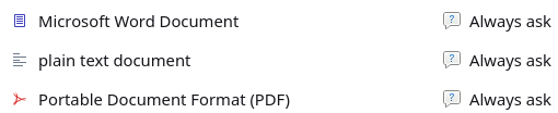 Under preferences I have "Always ask" enabled for PDF-Files because I want to be able to choose the action depending on the document. I have the same config for Docx-Files.