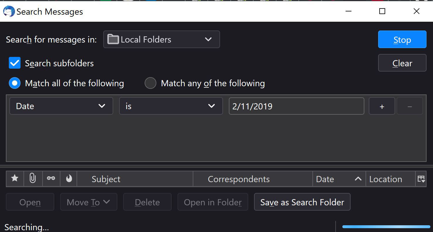 Here is an example, I know I bought something on 2 Nov 2019 but can't find the receipt in my emails which has many layers of subfolders. Here's a simple search to find all emails on that date but it never stops and never finds anything - I have other emails on that date - I grabbed this screenshot after it was running for 30 minutes: