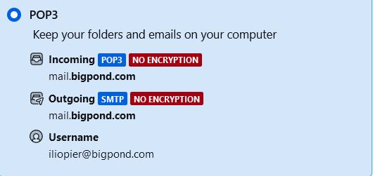 Hi, I have now Thunderbird 102.13.0 (64). When I install the new version it comes up with: AVAILABLE CONFIGURATION Incoming POP mail.bigpond.com Outgoing SMTP mail.bigpond.com
