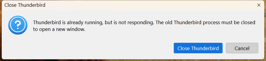 When I first start Thunderbird it works fine, for a while (as in possibly days). Then I notice when I try to send an email it just spins its wheels. When I shit it down then restart I get a poo-up saying Thunderbird is already running but not responding. Checking task manager I see two instances of Thunderbrd.exe in the liist. In order to successfully restart it I must first kill all instances (I use Sysinternals pskill.exe for this). Then when it restarts it typically downloads a messages that were previously blocked.