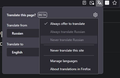 Settings for "Translate this page" (beta). The "Never translate" button is grayed out. How can I fix this?