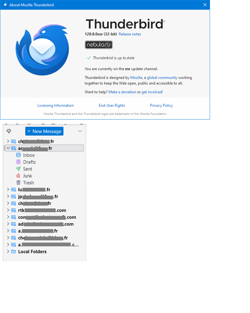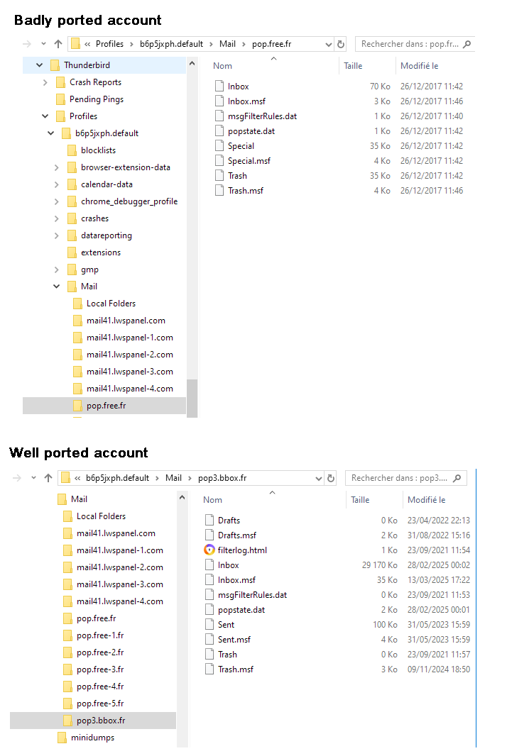 I set the same version of Thunderbird on both PC: 128.8.0esr (32-bit) I also tried release versions 136 (64 bits) and 128 (64 bits) on the new computer: same result.