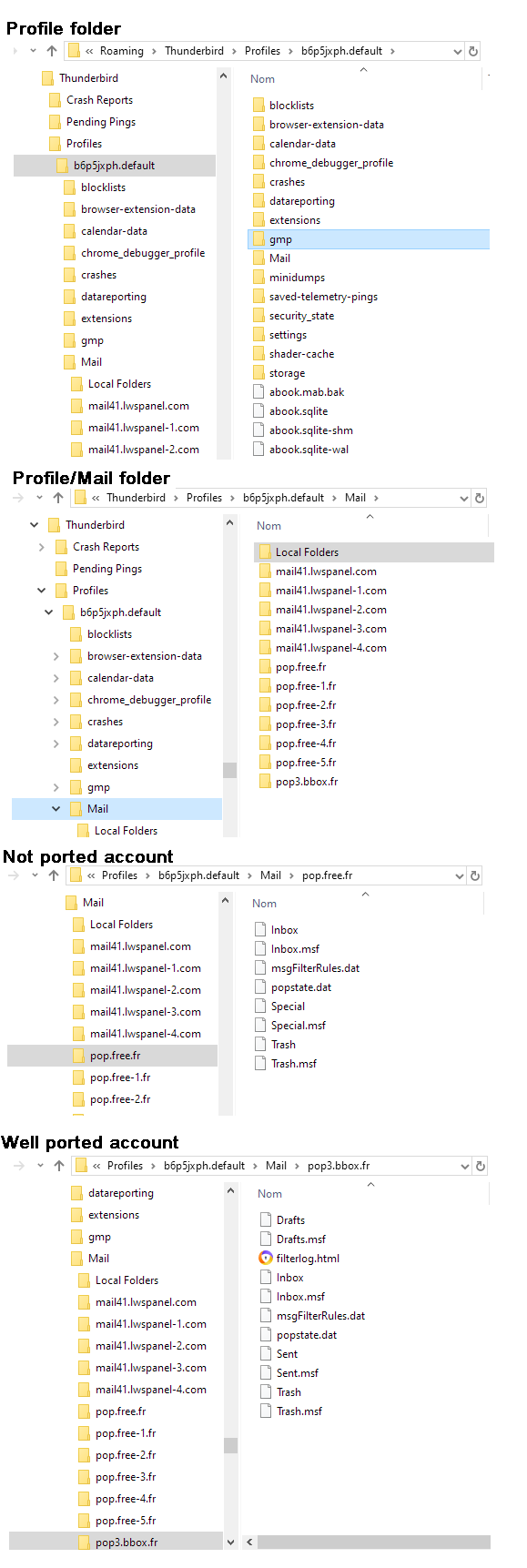 - Overwrite new %APPDATA%/Roaming/Thunderbird folder with old content - Clear new %APPDATA%/Roaming/Thunderbird folder then paste old content - Use Thunderbird 32 bits ESR (the same version as in the old system) - Use Thunderbird 64 bits release - Also paste/replace %APPDATA%/Local/Thunderbird folder