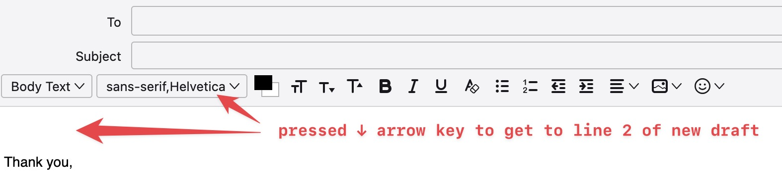 … yet there is a third empty line that precedes both of them when I click “+ New Message” or reply to email. When I go to line 2 or 3, then return to 1, it switches to Variable Width, and the font is also much smaller.