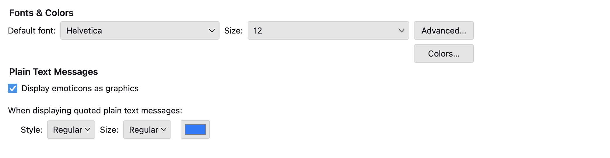 Ok, this may not answer all of your questions, but it's a start: - The 'beauty' of variable width is that no font specification is sent, allowing recipient full control of that. That is why I encourage setting both Latin and OtherWritingSystems to be identical and I set my font size on every option, including plain text. In doing this, I see my chosen font (in your case, Helvetica) on all of my sent messages, allowing the recipients to see in theirs - the font specification for the HTML setting will NOT send a font size if MEDIUM is specified, further empowering the recipient.