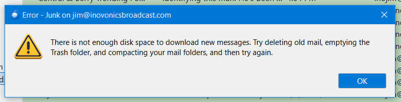 I'm running Thunderbird 140.2.0esr (64-bit) under Windows 10, and prior to the last few days everything has been running normally. I have three POP/SMTP accounts, which work in all respects, except for the Junk folder in only one of the accounts. Thunderbird marks a junk mail in that account as Junk, but leaves it in the Inbox. When I try to transfer it manually into the proper Junk folder I get the message in the first attached snapshot.
