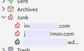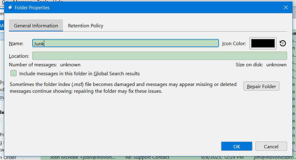 What is the procedure for giving the Junk folder for that account a proper name? This had been working fine, but just seems to have developed amnesia. I tried compacting all folders and doing a 'repair' on this Junk folder, as recommended in the message, but that didn't help. Oh, and that Junk folder in the left pane has a black icon, whereas the working accounts have red ones (third snapshot).