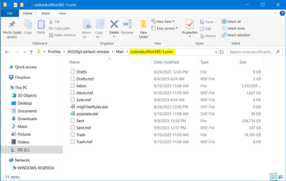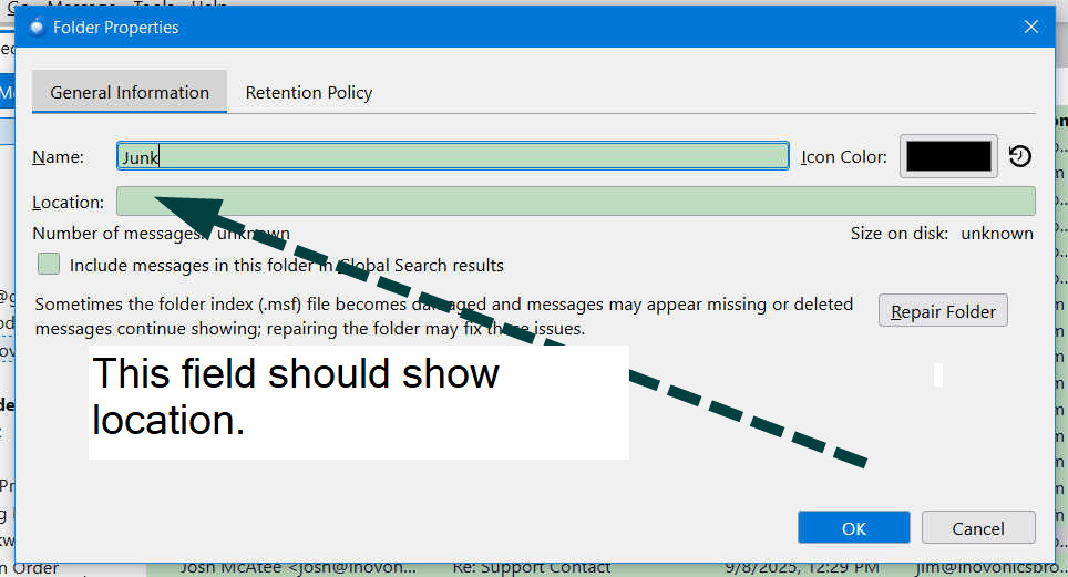 The Junk folder for the subject account shows Properties per the second attached snap. The location for the Junk file is missing, which is probably why this situation is giving me grief.