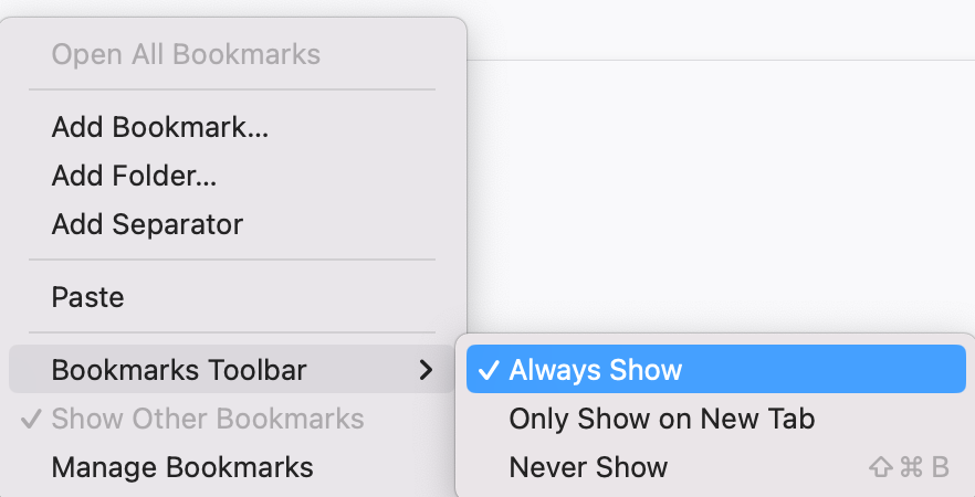 Right click on the toolbar, it should allow you to select between "Always Show, "Only Show on New Tab", and "Never Show".