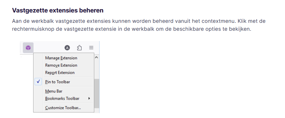 Ik kan geen extensies vastpinnen aan de toolbar. Krijg de optie bij het aanklikken van de extensie met de rechtermuisknop.