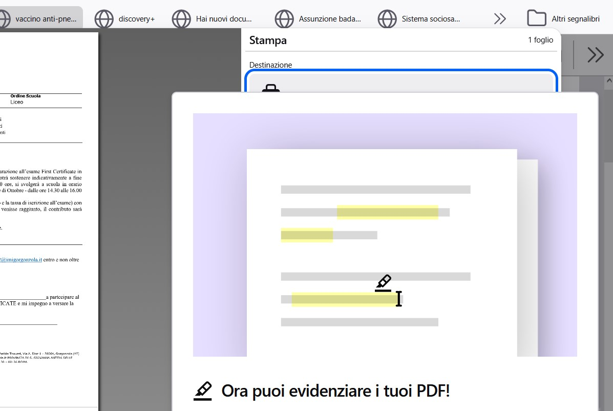 per stampare un pdf clicco sul simbolo "stampante", il file viene "spostato" nella zona stampa su cui scegli la stampante, paper size, etc il problema è che appare una specie di pop che non si riesce a chiudere Sembra una pubblicità di un editor pdf