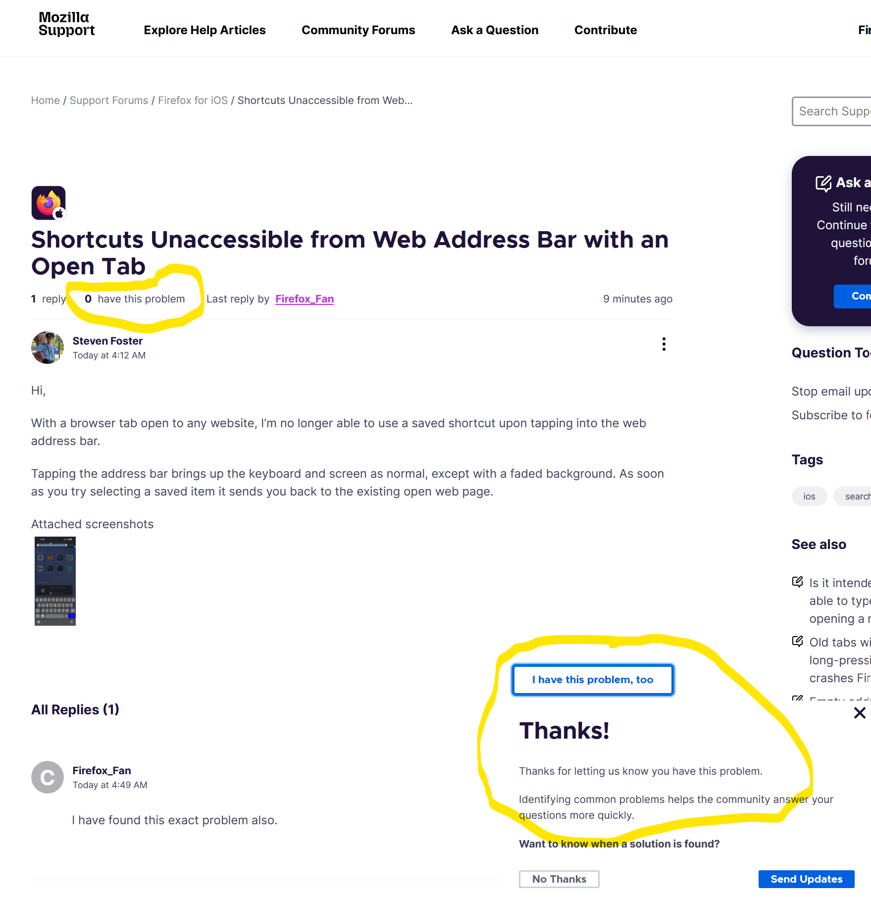 I have repeatedly clicked "I have this problem, too" but the item still says "0 have this problem". See the attached screenshot.