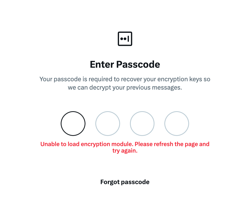 X is now requiring users to enter and verify a 4-digit passcode to be able to use the DM feature. Firefox on Mac won't let me do this. Every time it produces an error message: