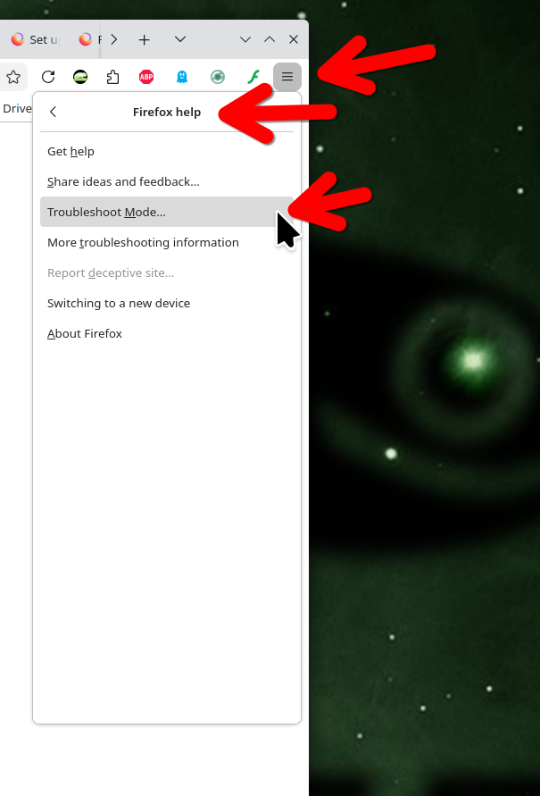 The link is there for Troubleshoot mode. From the settings menu --> Help --> Troubleshoot Mode. see screenshot https://support.mozilla.org/en-US/kb/diagnose-firefox-issues-using-troubleshoot-mode#search
