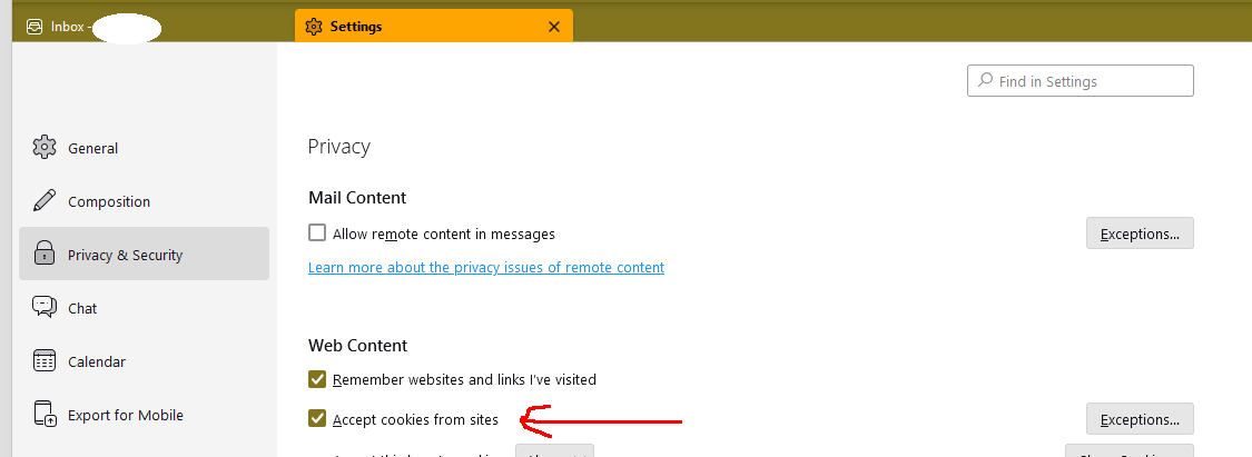 I have looked everywhere but I cannot find where to accept cookies in Thunderbird. Could you explain where it is located please. Thank you.