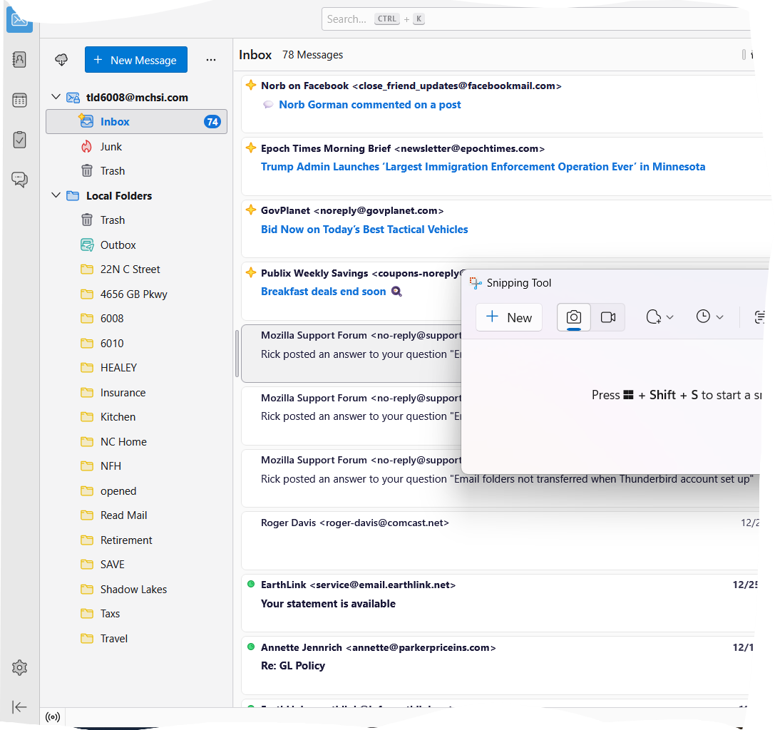 Once you see all the folders in Thunderbird that you need to get messages out of, you can use my instructions above to copy their messages to local folders.