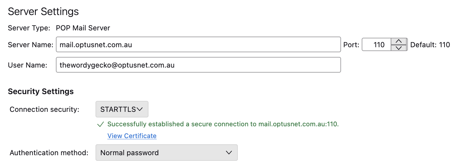 > When I go to Server settings for incoming and check connection to server it is fine.