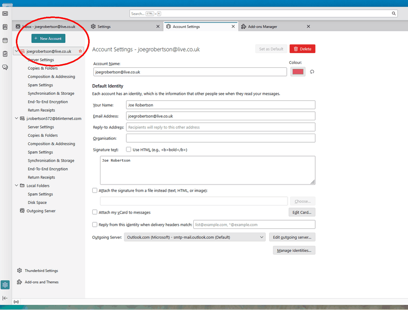 Hi, I have changed my PC and in setting up Thunderbird I find I can only add two accounts. I cannot find a way to add that third address and account. I am looking for help with that, please.
