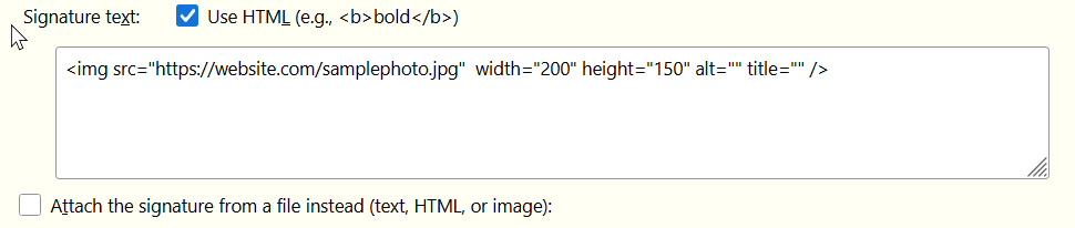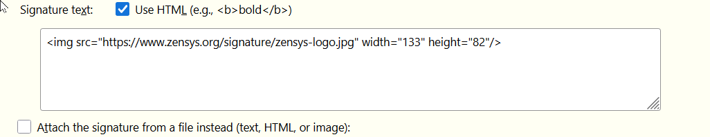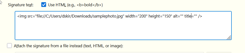 There's nothing to screen shot though, because it does not stay in the " attach the signature from a file instead " field when I exit the menu. I'm not using HTML, I'm just pointing to a JPG file.