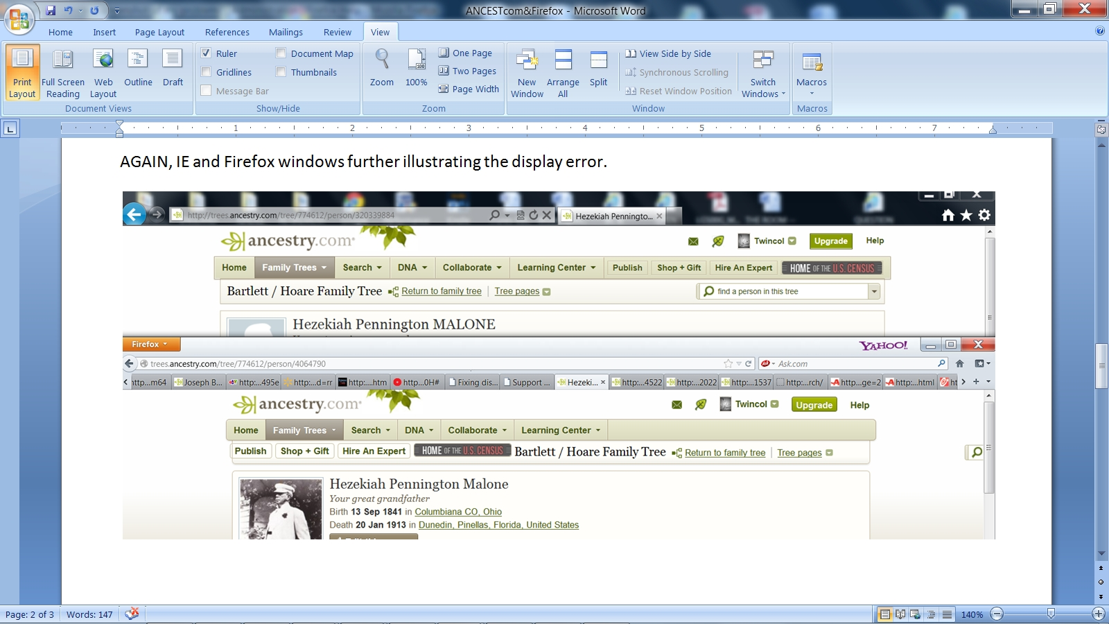 Here's an illustration of the Firefox vs. IE view of Ancestry.com heading . Note that IE displays the "search family" window in the proper level three row and within their outlined area, rather than the Firefox display with the tiny left hand end of it outside the outlined Ancest.com heading area. Note also that Firefox has moved ummm 3 or 4 tabs from level 2 to level 3.