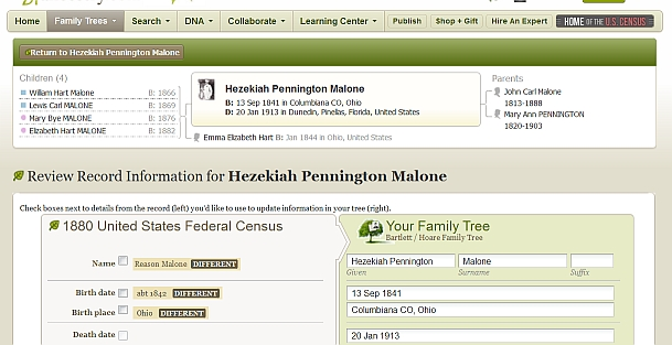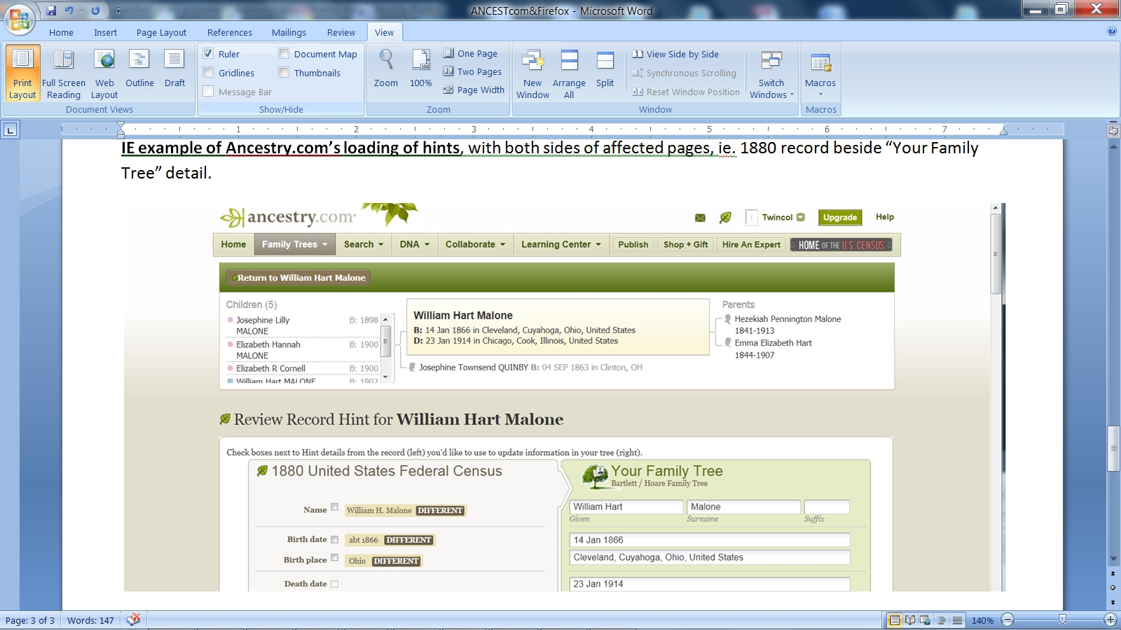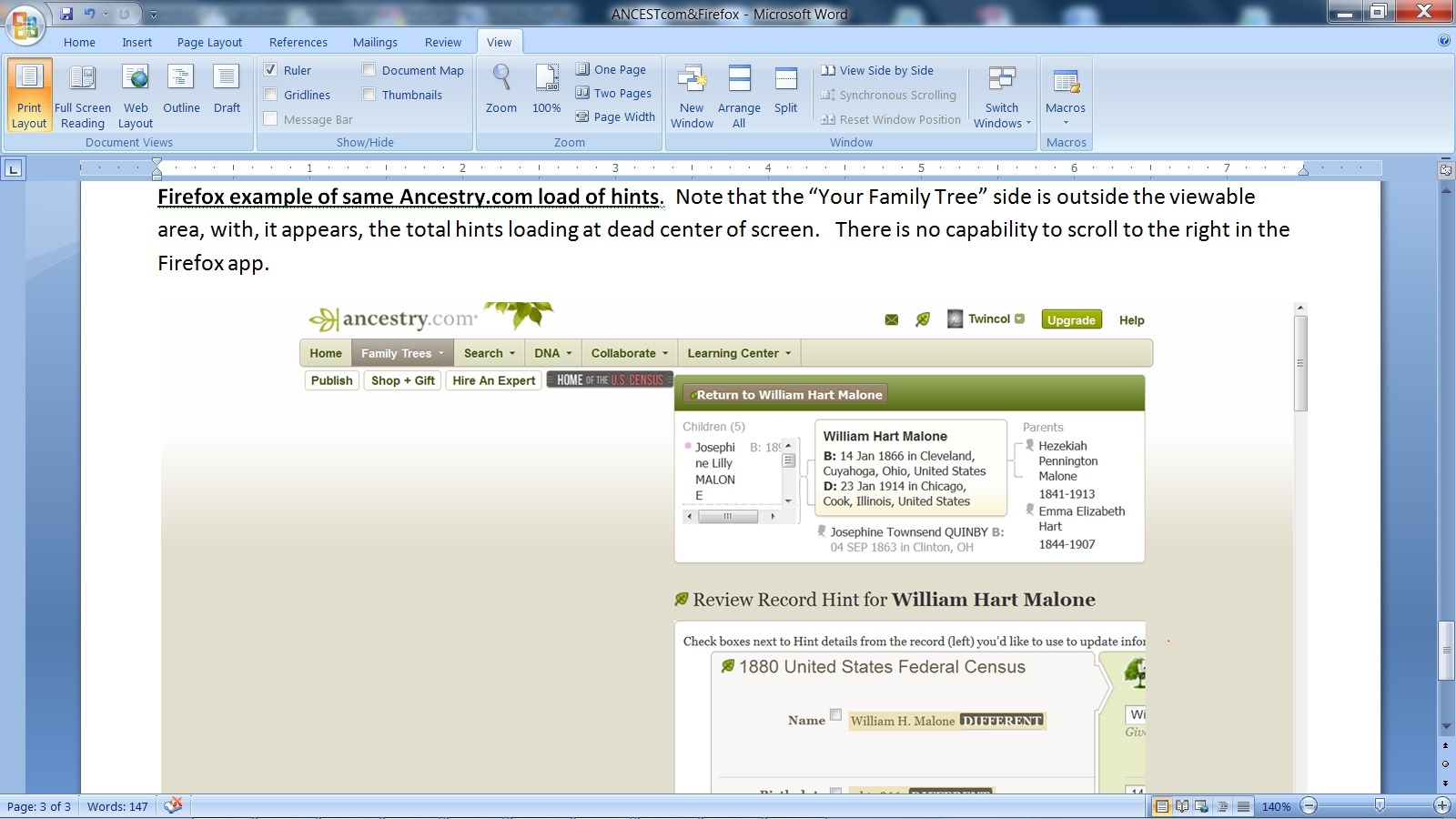 Then . . . with the second image you'll see the IE proper display of "hints" search results. The researcher is to select which hints to add, etc. etc. etc. But with image three you'll note that Firefox has slammed the entire results to the right of center, displaying only the results, with the proposed ancestor section outside of the viewable area. Note, however, that it IS there, just not viewable.