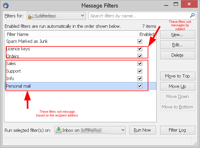 What I want: The filters to run on INBOX only. The messages, whose subject matches set criteria to go to Orders or Newkey. Remaining messages, whose To address matches set criteria to go to Sales or Support.
