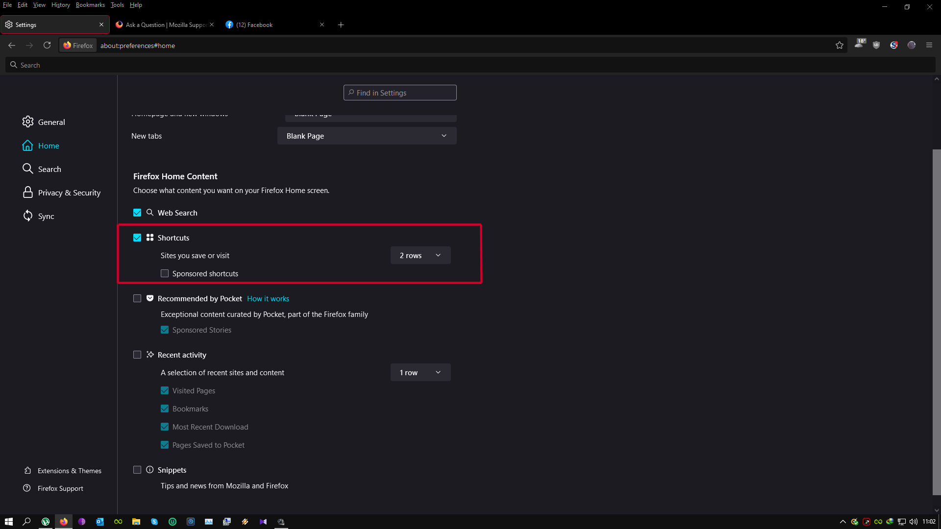 Lost Shortcuts (2 rows) from Firefox new tab... How do I get them back... Shortcuts is activated in options, still no "icons" to launch my most used websites