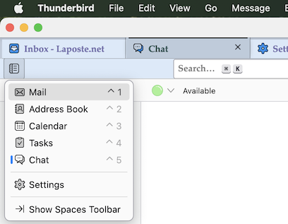 You have opened the "Chat" tab in the tab bar! Go to the Spaces Menu button in the upper left corner of the toolbar and select "Mail" or hit the Cmd+1 keys. Tu as ouvert l'onglet "Chat" dans la barre des onglets. Va au bouton du "menu des espaces" en haut à gauche et sélectionne "Courrier" ou tape les touches Cmd+1.