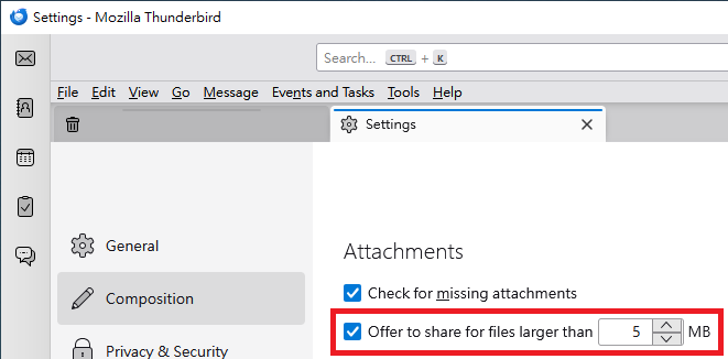 The following steps might be helpful: "Settings" > "Composition" > "Attachments" section > tick "Offer to share for files larger than __ MB". (Please see the attached image.)