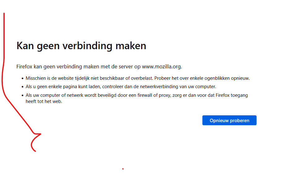 Probeer eens verbinding te maken in de Probleemoplossingsmodus. Het is ook mogelijk dat uw firewall verkeer vanuit Firefox tegenhoudt. Lees in dat geval Problemen bij het verbinden met websites na het bijwerken van Firefox verhelpen.