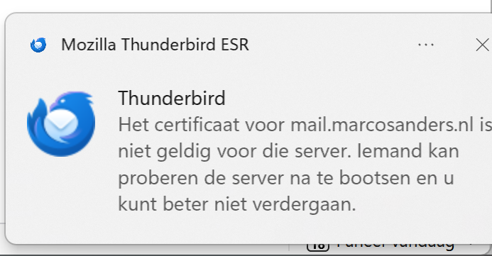 De foutmelding "Het certificaat voor [MAIL.DOMEIN] is niet geldig voor die server" geeft aan dat er een probleem is met het SSL/TLS-certificaat van de mailserver. Dit kan verschillende oorzaken hebben: