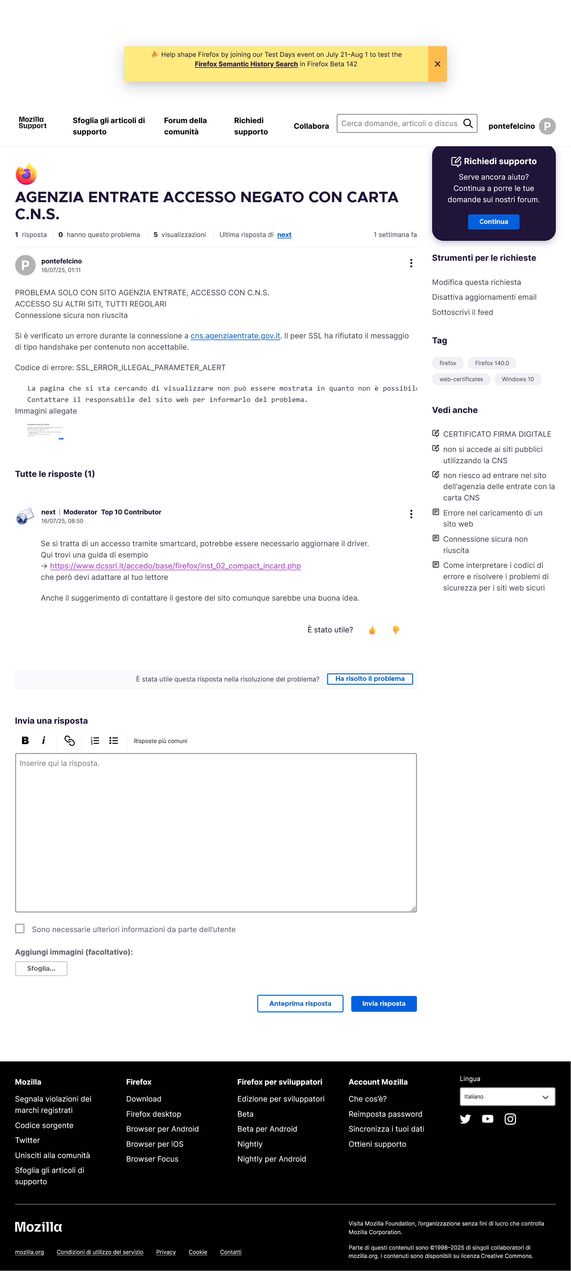 In FIREFOX carta CNS funziona su tutti i siti in cui si necessita di accesso CON IDENTIFICAZIONE TRANNE che su sito AGENZIA ENTRATE