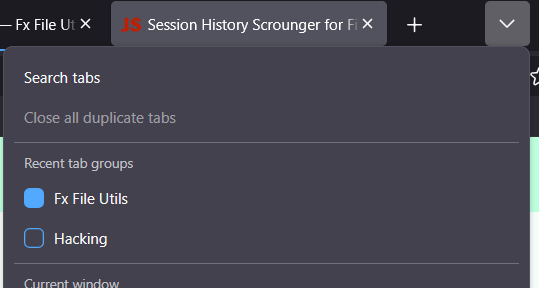 Within the list, tabs should be grouped by: Open Windows, Saved/Closed Tab Groups, Closed Windows.