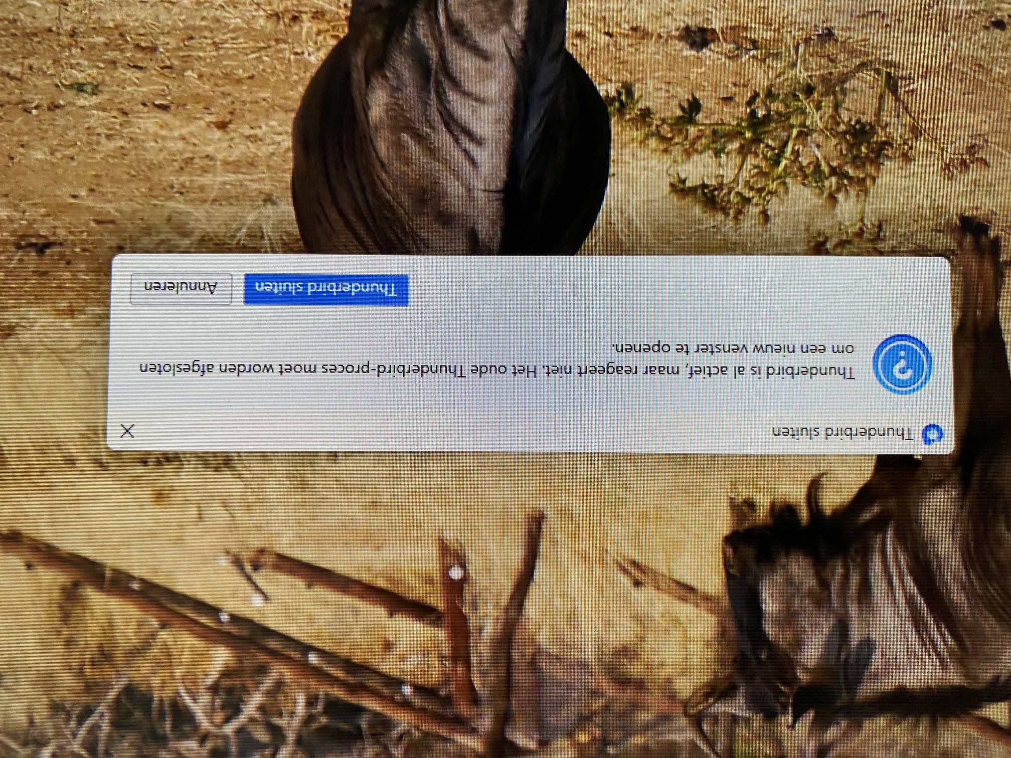 Ja, dat helpt niet, dan verschijnt ook weer het venster "Thunderbird is al actief, maar reageert niet. Het oude Thunderbird-proces moet worden afgesloten om een nieuw venster te openen".