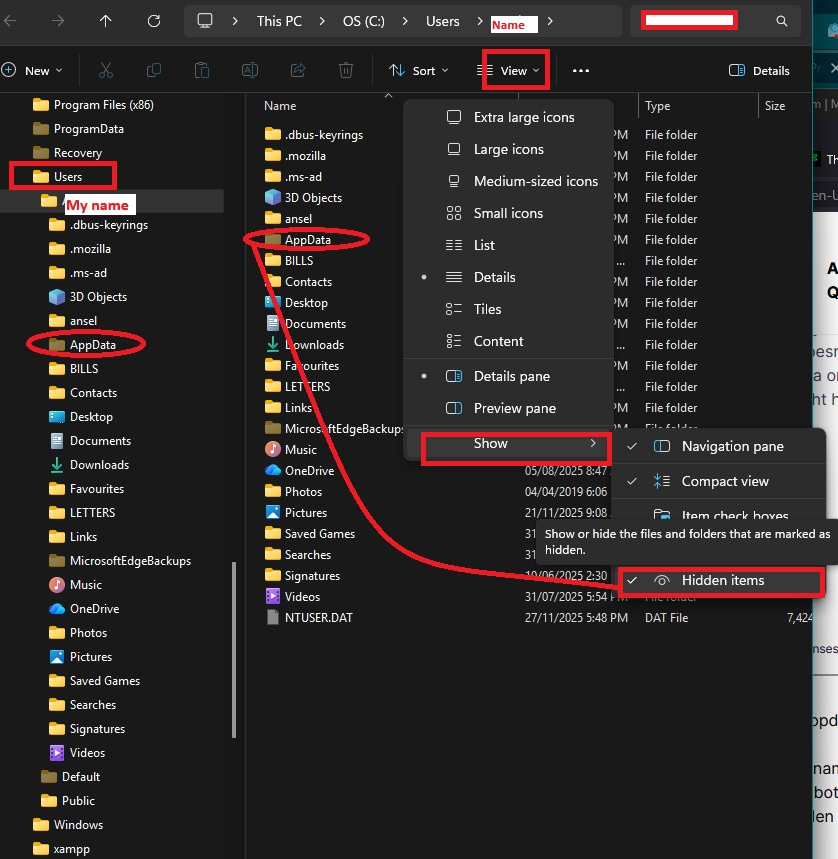 If you open : C://Users/ your user account name Click on 'View' to see drop down and at the bottom of list - hover mouse over 'Show' to see more options and at the bottom select 'Hidden Items'