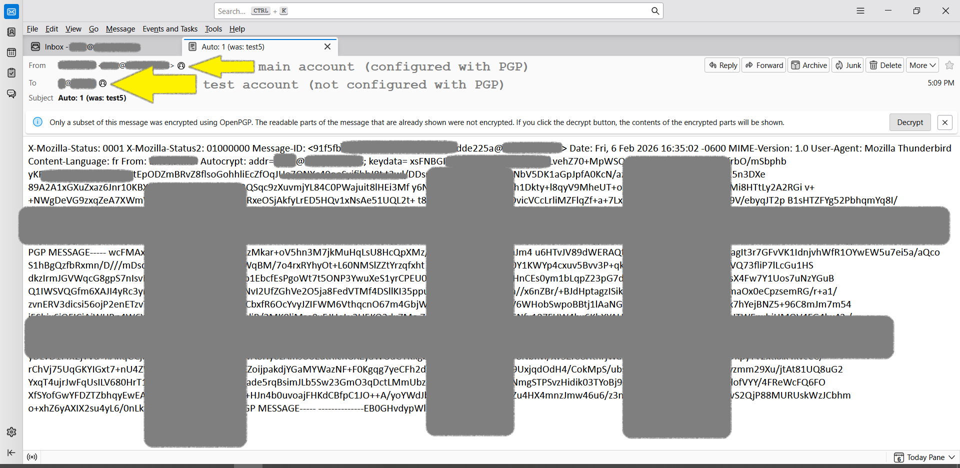 Also, it should be noted, although the message is encrypted, it can't be decrypted, presumably because there was no valid key against which to encrypted it in the first place. Clicking the "Decrypt" button has no effect on the displayed message.