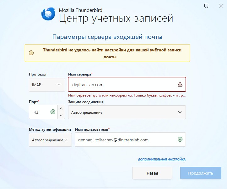 "Dear Support Team, I am trying to configure my email account (gennadij.tolkachev@digitranslab.com) in Mozilla Thunderbird, but I am encountering an issue. The automatic configuration fails with the message: "Thunderbird failed to find the settings for your email account." When I proceed to the manual setup screen, the Incoming Server field is pre-filled with ".digitranslab.com" (including the leading dot). The application rejects this, stating that the server name is empty or invalid (it says: "Server name is empty or incorrect. Only letters, numbers, - and . are allowed"). Could you please provide me with the correct manual server settings for our mail server? Specifically: Incoming Server (IMAP): Server hostname Port Connection security (SSL/TLS, STARTTLS, or None) Authentication method Outgoing Server (SMTP): Server hostname Port Connection security Authentication method Thank you for your assistance. Best regards, Gennadij Tolkachev"