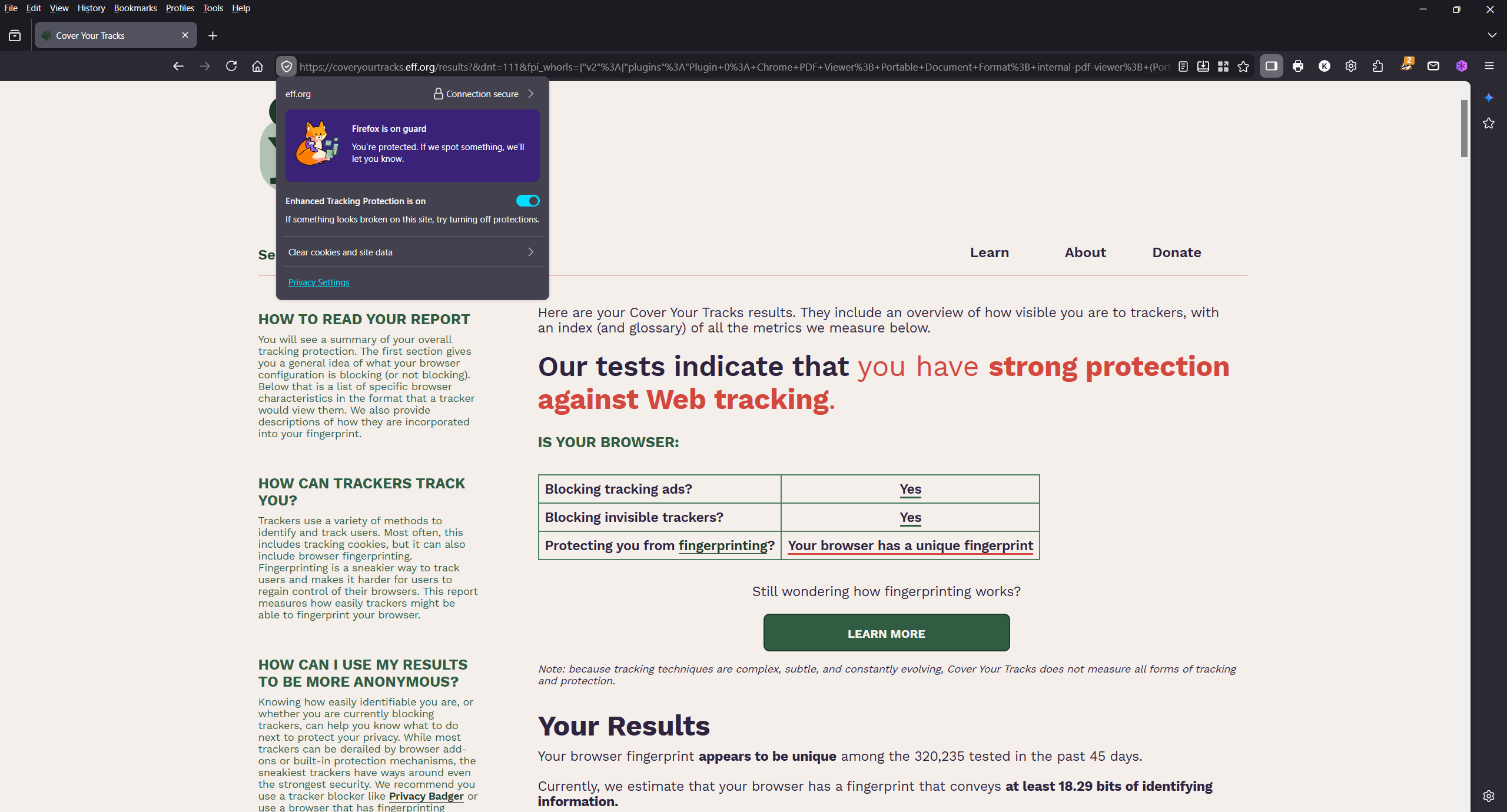 I have configured advance tracking protection and set all variables to true in the configuration editor except "privacy.resistFingerprinting.jsmloglevel" which is set to "warn". I still have a unique fingerprint. Other than starting over is there anything else I can do?
