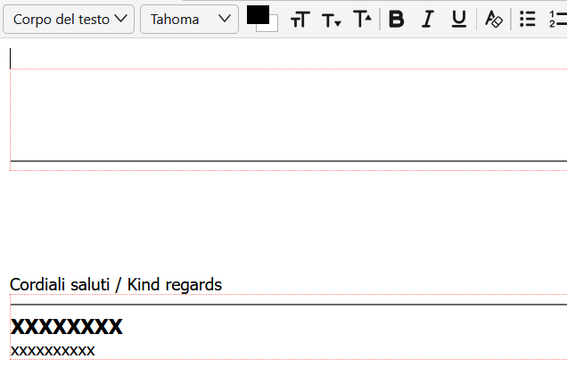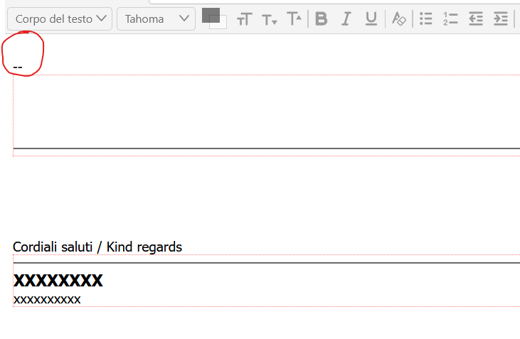 Buongiorno, sto usando la versione 141.0 di Thunderbird 64 bit e ho notato la seguente anomalia. Quando creo un nuovo messaggio di posta usando il bottone "+ Nuovo messaggio" all'inizio del messaggio vengono inseriti una riga vuota e una riga con due trattini. Sto utilizzando la firma letta da un file html; lo stesso file viene visualizzato correttamente (quindi senza riga nè trattini) se aperto con Firefox. La cosa strana è che facendo rispondi o inoltra di una mail esistente i trattini e la riga vuota non vengono inseriti. Allego qualche immagine che spiega meglio la situazione. Ho chiesto a un collega e la stessa anomalia capita anche a lui. Potete aiutarmi? Grazie.