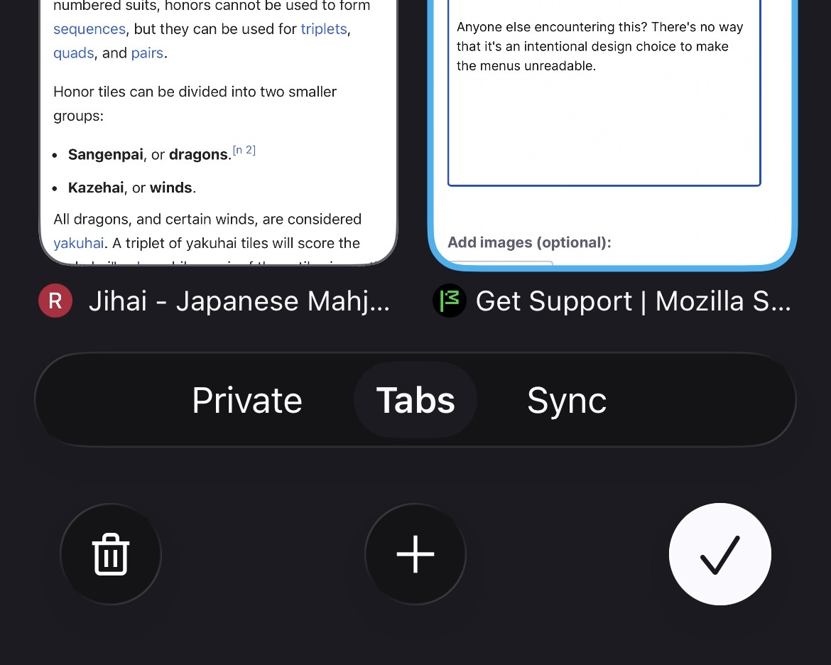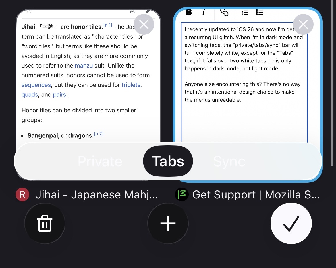 I recently updated to iOS 26 and now I'm getting a recurring UI glitch. When I'm in dark mode and switching tabs, the "private/tabs/sync" bar will turn completely white, except for the "Tabs" text, if it falls over two white tabs. This only happens in dark mode, not light mode.