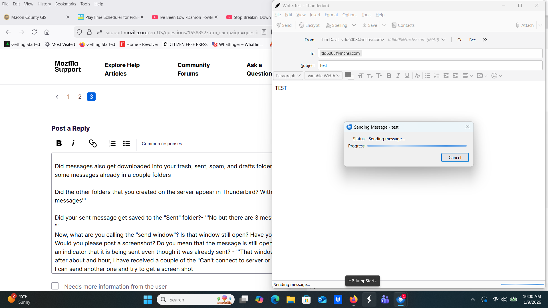 Did your sent message get saved to the "Sent" folder?- No but there are 3 messages from 2009 in there Now, what are you calling the "send window"? Is that window still open? Have you received an error message? Would you please post a screenshot? Do you mean that the message is still open in a "compose" window with an indicator that it is being sent even though it was already sent? - That window was frozen and I closed it after about and hour, I have received a couple of the "Can't connect to server or the Connection refused" I can send another one and the screenshot is attached the message went through immediately but the progress window just keeps running